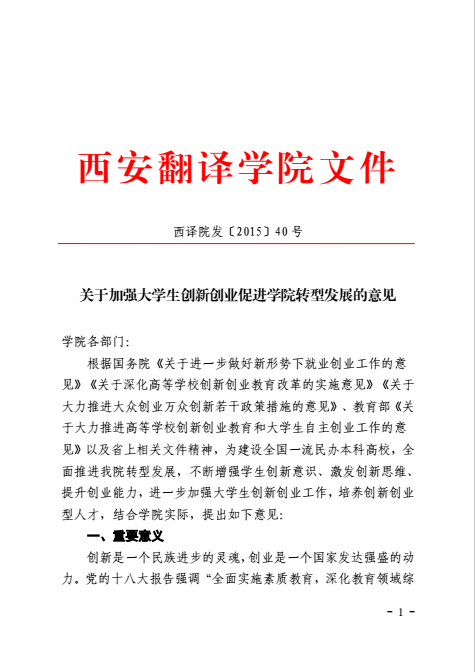 关于加强大学生创新创业促进学院转型发展的意见